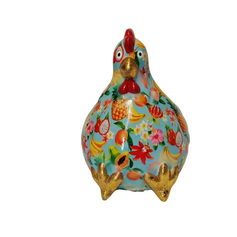 TIRELIRE POULE CLAIRE POMME PIDOU BLEUE ET FRUITS