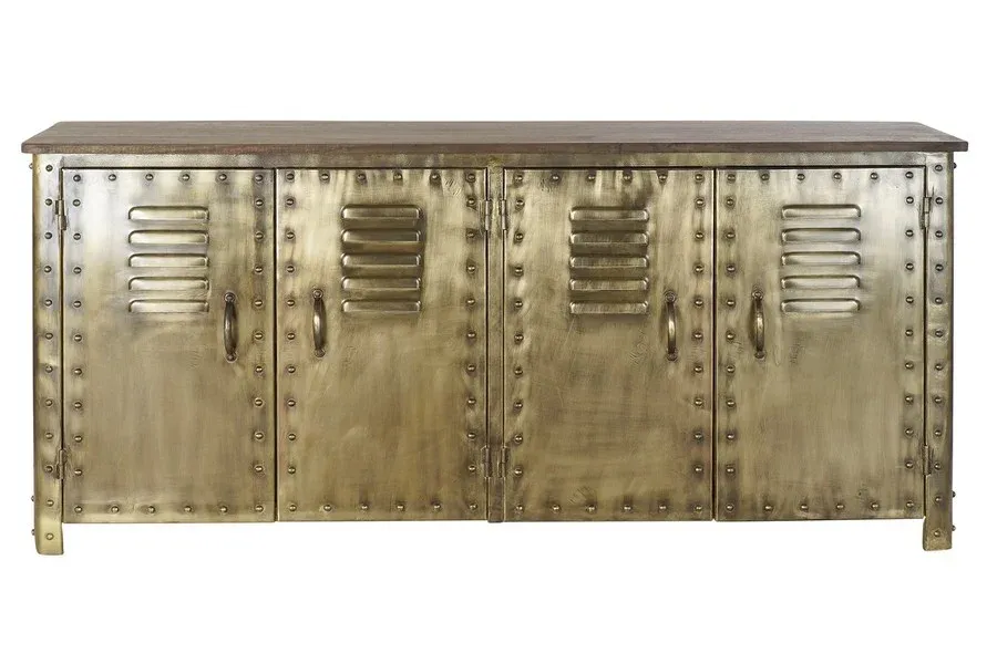 BAHUT BAS EN METAL LEGEREMENT DORE ASPECT RIVETE 4 PORTES 152 X 35 X 69 CM
