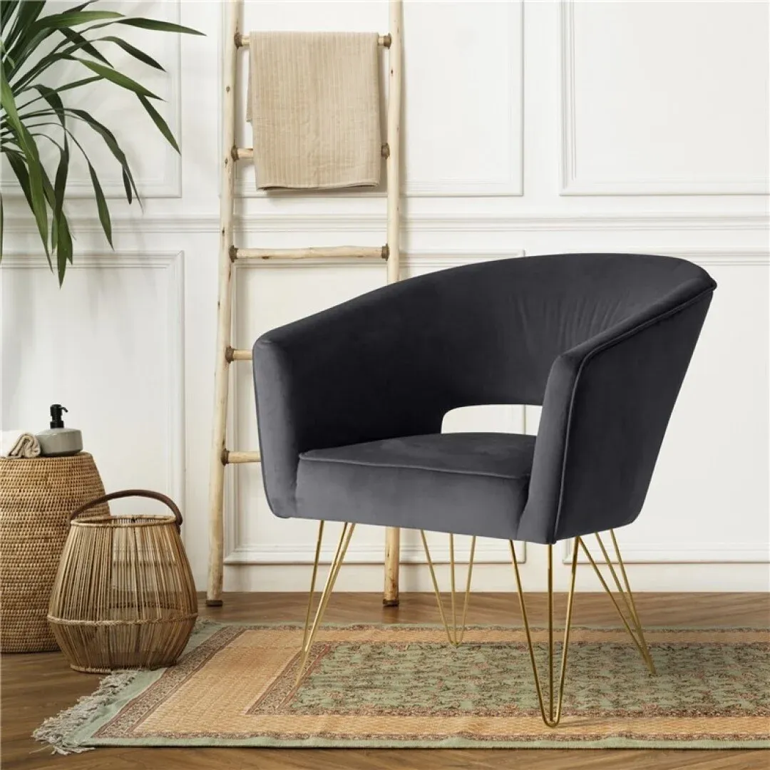 FAUTEUIL MAZIO VELOURS ANTHRACITE PIEDS METAL FINITION DORE 71 X 75 X 69 CM
