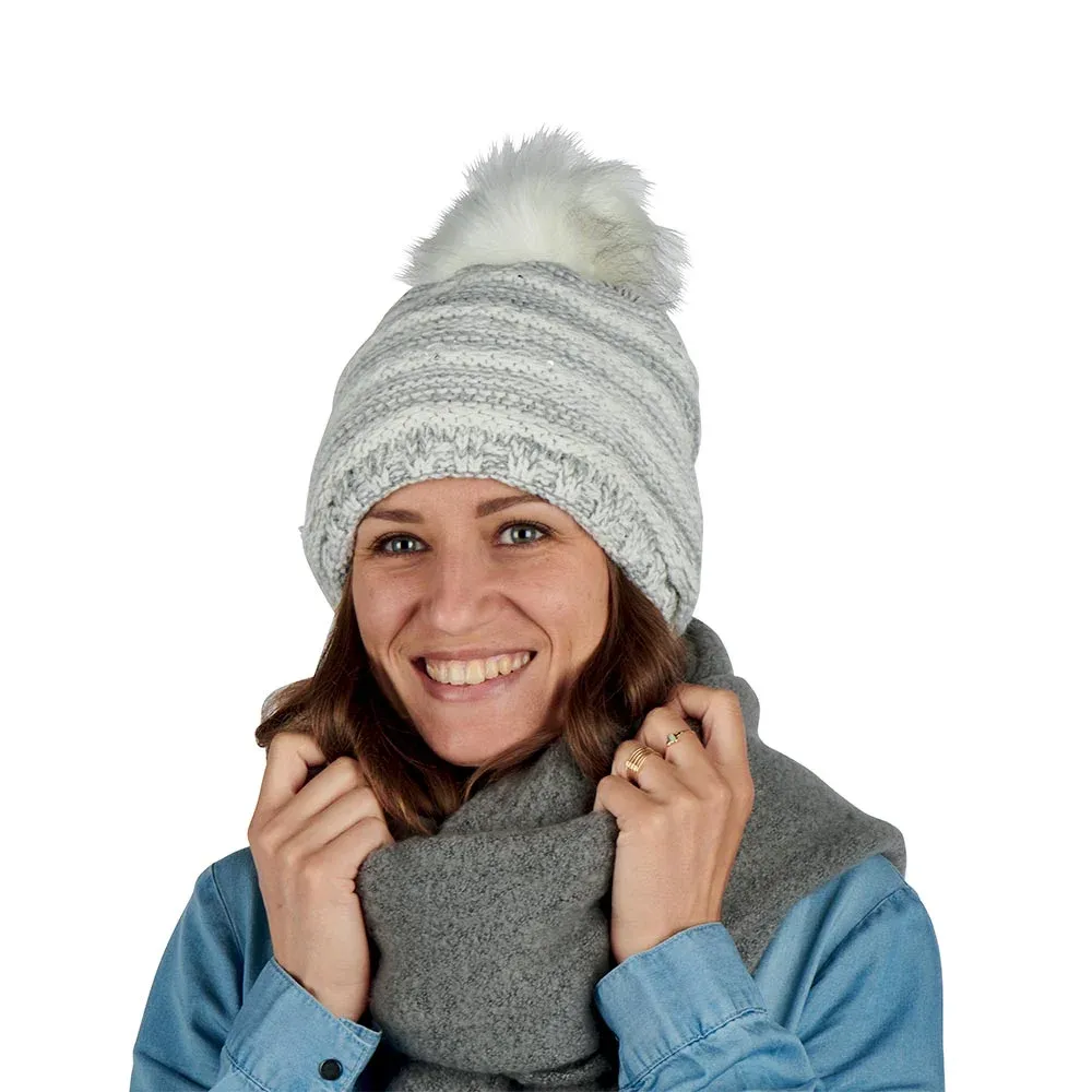 BONNET DOUBLURE POLAIRE POMPON COULEUR BLANC ET GRIS 24 X 30 CM