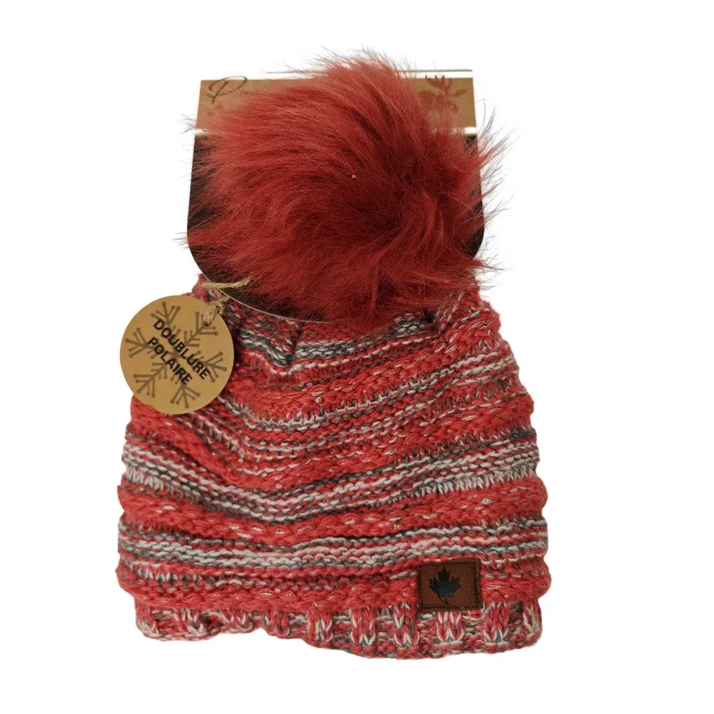 BONNET DOUBLURE POLAIRE POMPON COULEUR CORAIL ET GRIS 24 X 30 CM