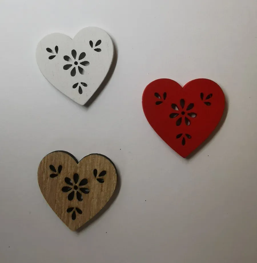 BOITE DE PETITS COEURS EN BOIS AJOURES 3 COULEURS ROUGE BLANC NATUREL 3 CM