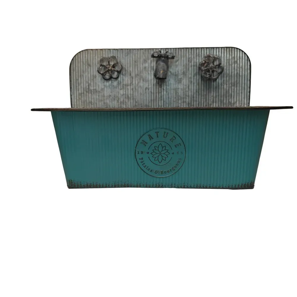 JARDINIERE EN METAL BLEU NATURE PETALES ET BOURGEONS ROBINET 40 X 26 X 26 CM