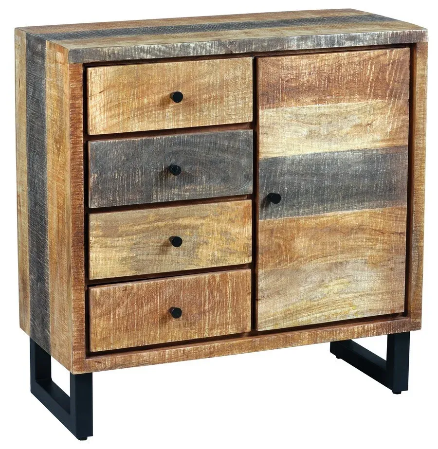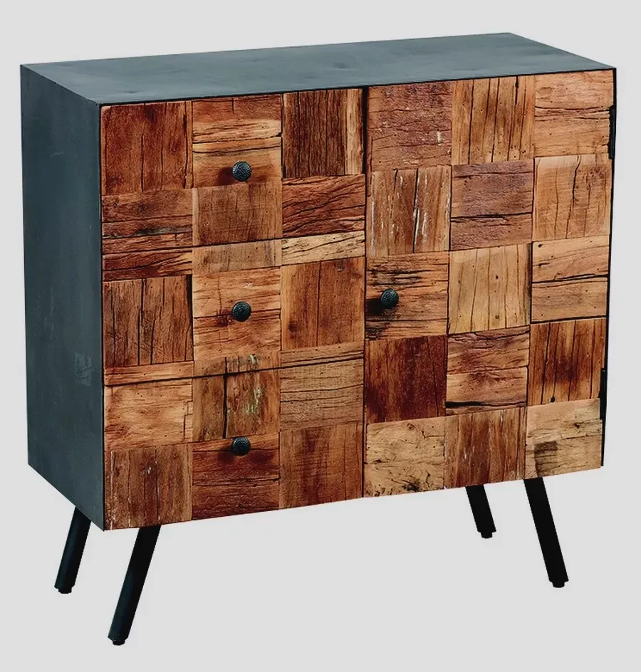 BAHUT D’ENTREE 1 PORTE 3 TIROIRS METAL NOIR ET BOIS RECYCLE 85 X 41 X 81 CM