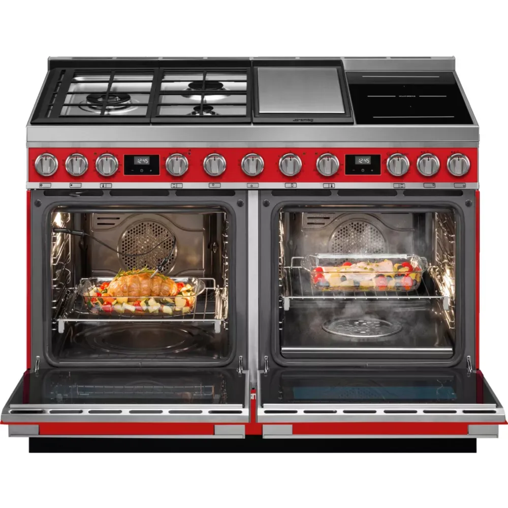 Cette cuisinière SMEG CPF120IGMPR ROUGE de 120 cm vous apportera à la fois esthétisme et qualité de cuisson hors pair. Deux fours multifonctions à chaleur tournante : le four de gauche possède un mode de nettoyage pyrolyse ainsi qu’une sonde à viande tandis que le four de droite est équipé de la fonction vapeur assistée.