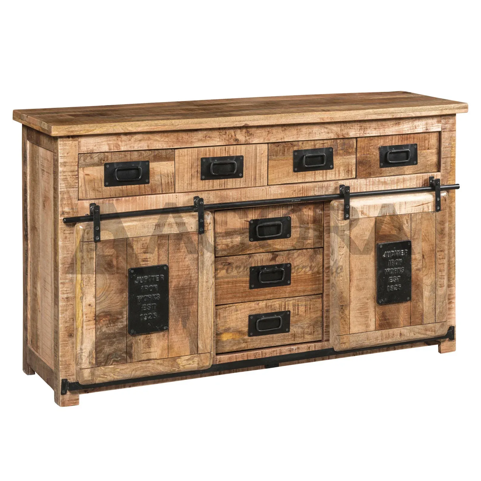 Avec ses 7 tiroirs, ses 2 portes coulissantes, Structure en manguier massif habillé de métal noir.