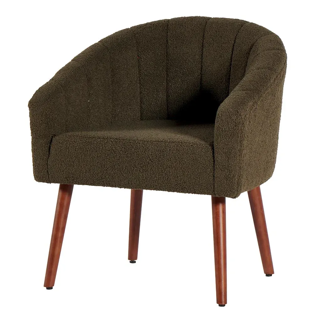 Un beau fauteuil en tissu bouclé « façon laine de mouton » couleur kaki avec une assise de 46 cm de hauteur