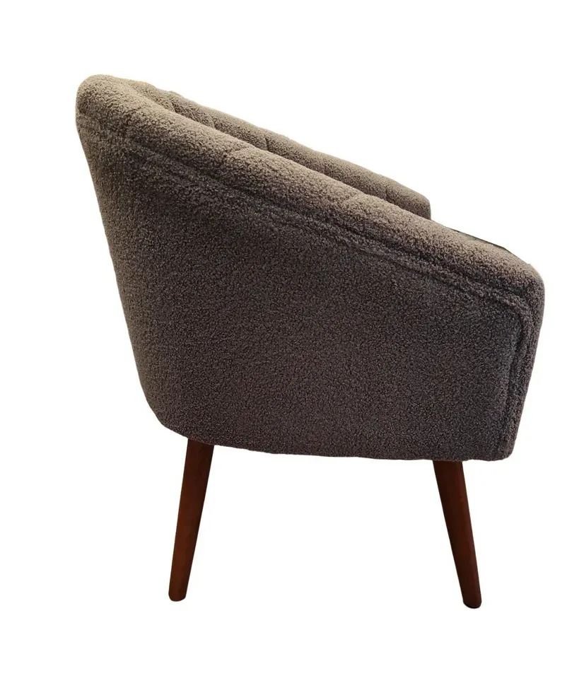 Un beau fauteuil en tissu bouclé « façon laine de mouton » couleur taupe avec une assise de 46 cm de hauteur