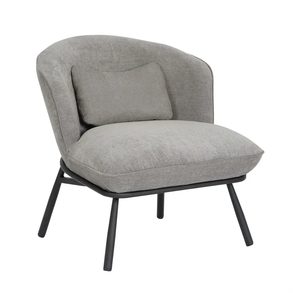 Un beau fauteuil en tissu chiné couleur gris clair avec une densité de mousse de 28kg/m3 pour le dossier et 25 kg/m3 pour l’assise sur pieds en métal noir mat