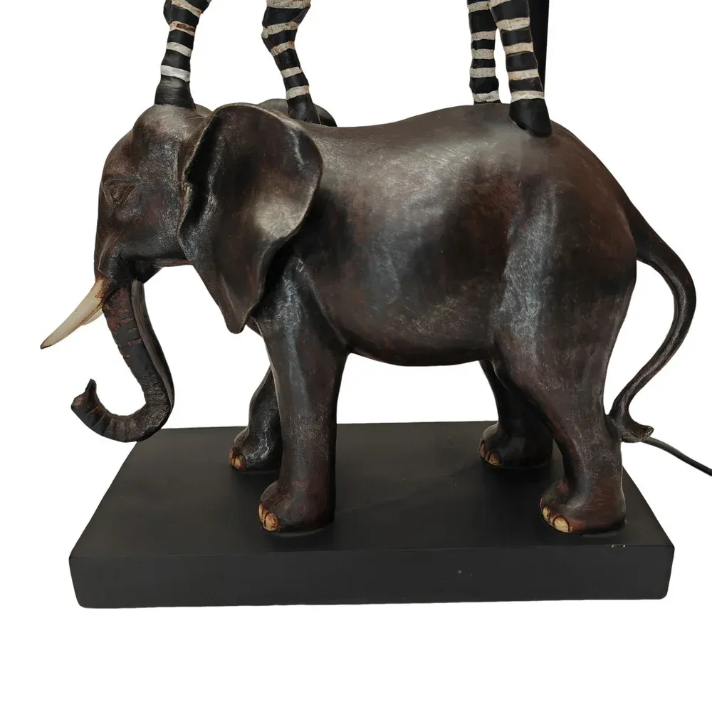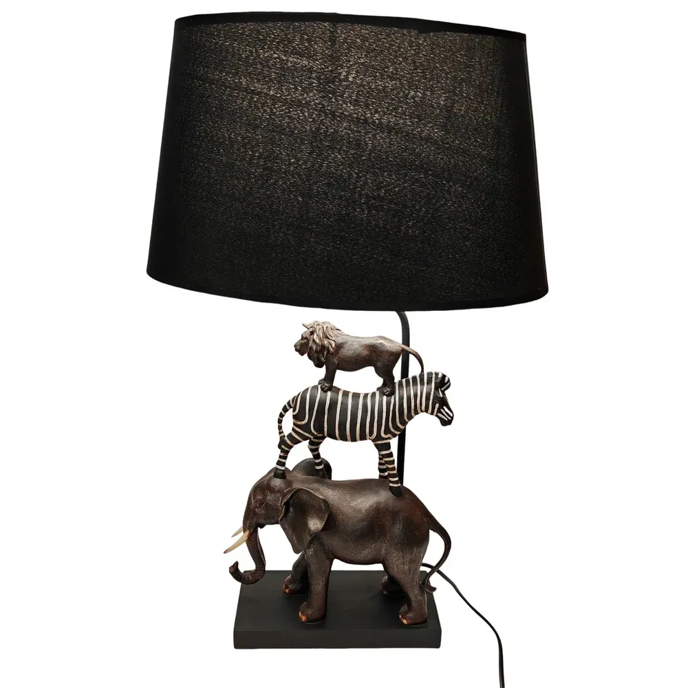 Une touche ludique et réaliste pour cette lampe à poser avec les animaux de la jungle (éléphant zèbre et lion) en résine, Abat-jour en tissu noir .
