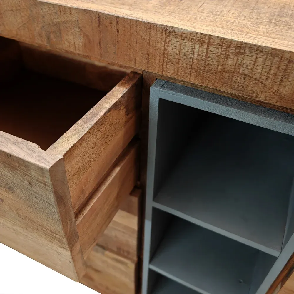 Le rangement optimisé avec les 2 portes et les 3 tiroirs. Les éléments sont en palissandre massif.