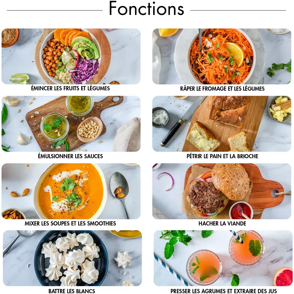 Idéal pour les familles nombreuses et ceux qui aiment recevoir, il vous permettra de pétrir les pâtes, battre les blancs en neige, fouetter la crème, hacher la viande, mixer les potages, émulsionner les sauces, réaliser les milk-shakes, émincer et râper les légumes et presser les agrumes.