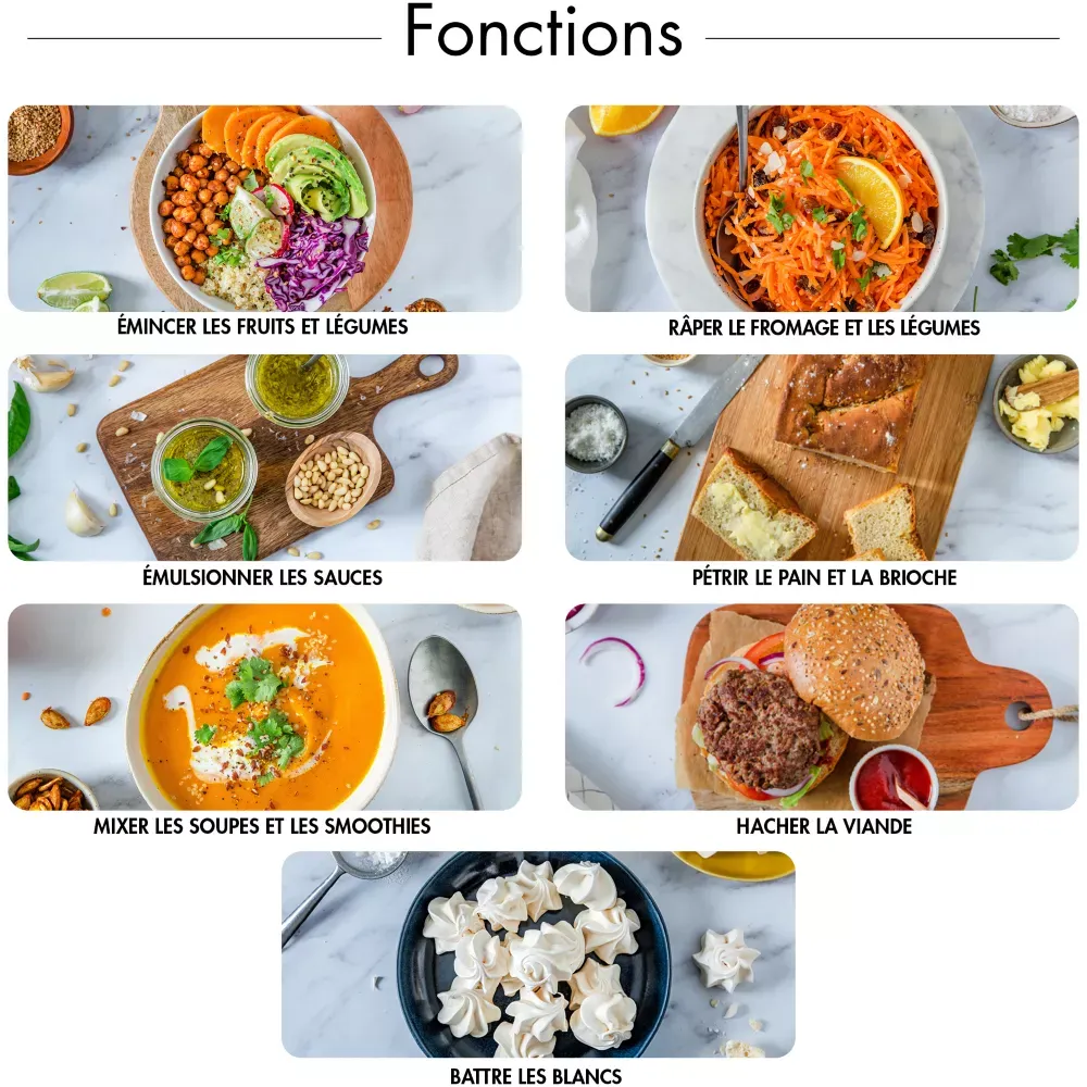 Il vous permettra de pétrir les pâtes, battre les blancs en neige, fouetter la crème, hacher la viande, mixer les potages, réaliser les milk-shakes, émulsionner les sauces et émincer et râper les légumes.