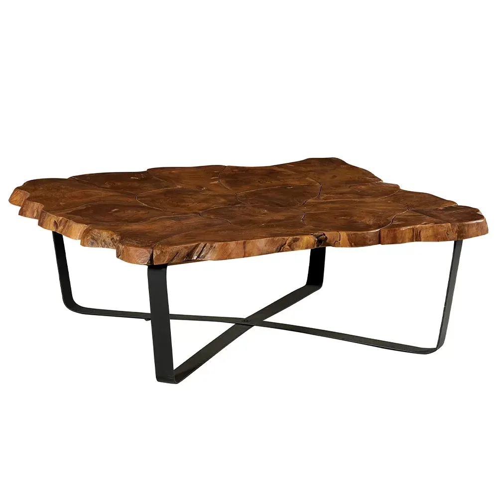 Table basse de la collection Palaos, en racine de teck façon puzzle et un pied en métal noir